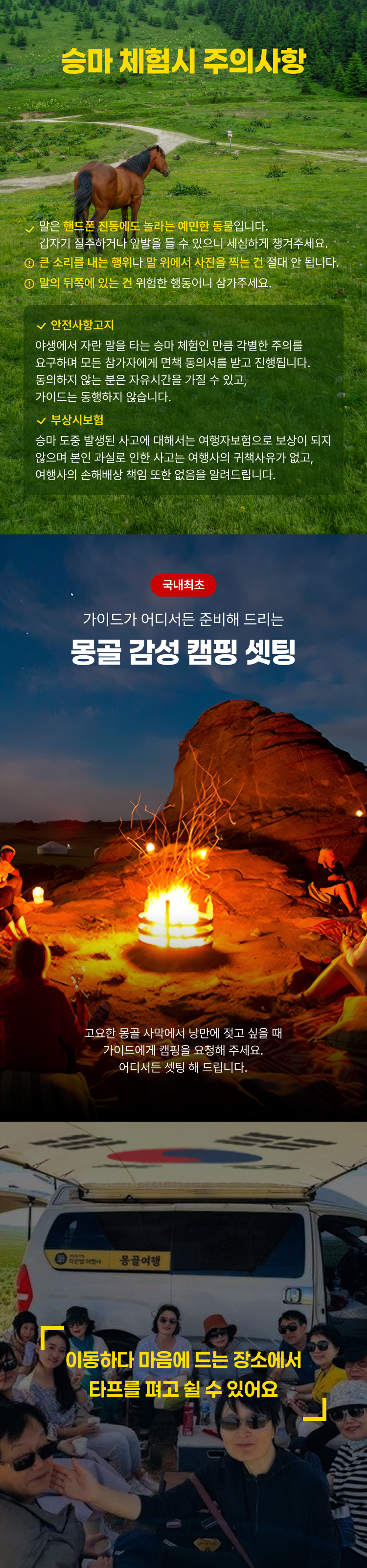 1. 본인은 이 여행이 다수 위험하고 특수한 상황들을 내포하고 있는 여행이 있음을 알고 신청합니다.(고비사막 등 몽골의 열악한 비포장 도로사정)