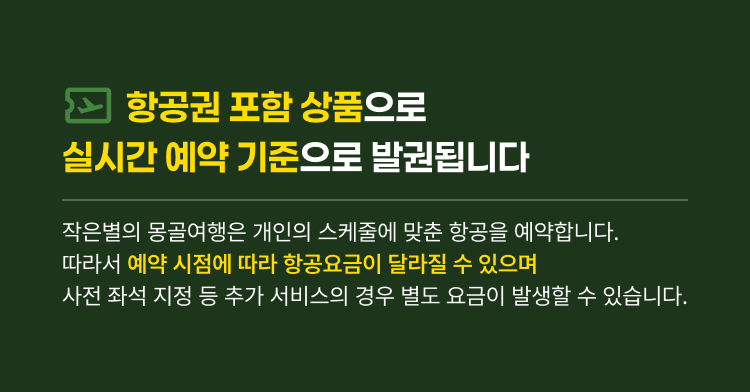 본 상품은 몽골항공 기준으로 만들어져 있으나 상황에 따라 대한항공/아시아나항공/티웨이항공/제주항공을 이용합니다. 부산 출도착의 경우 운항요일이 정해져 있으니 따로 문의해주시기 바랍니다.