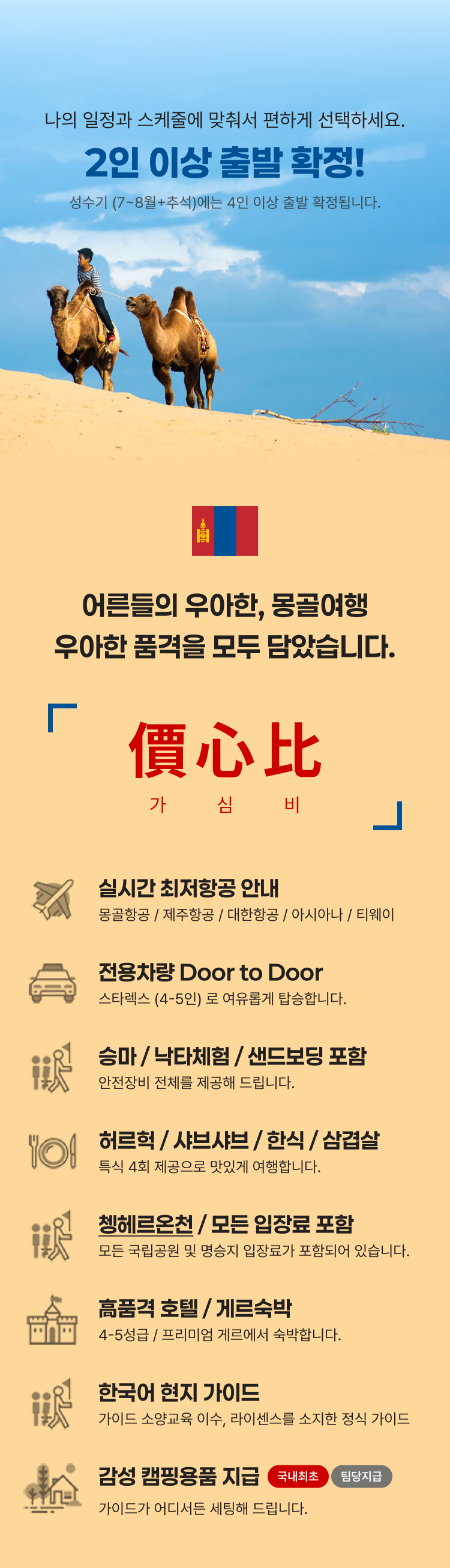 본 상품은 몽골항공 기준으로 만들어져 있으나 상황에 따라 대한항공/아시아나항공/티웨이항공/제주항공을 이용합니다. 부산 출도착의 경우 운항요일이 정해져 있으니 따로 문의해주시기 바랍니다.
